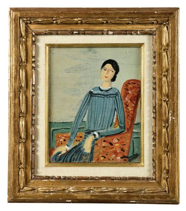 Cette huile sur toile marouflé sur panneau est intitulée Femme assise (robe gris-bleu et fauteuil rouge).